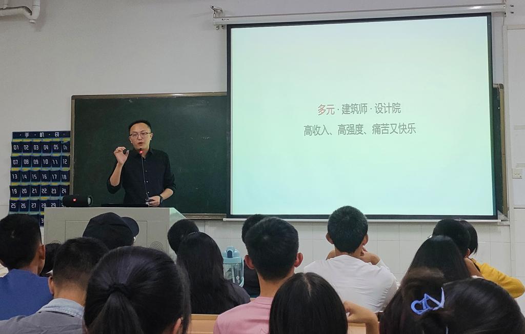 “建筑学真的是个坑吗?”“为什么那么多人劝退建筑学?”“建筑学的未来是怎么样的?”带着学生提出的疑问,吴博士从建筑学到底是什么,建筑学到底好不好,未来的我们又该何去何从等几个方面,从华丽宏伟的卢浮宫,隐匿于山间的古村落群,以及身边的一砖一瓦,带领大家跨越时空真实地去感受建筑学的内涵。报告中,吴博士以自己求学、教书、走进工地参与施工规划的丰富人生阅历和对建筑学的理解,用实际案例呈现建筑学之于人民美好生活的巨大作用,以及建筑师在这些作品中个人才华、能力和价值的体现,充分展示出了建筑学的多元化和深底蕴。最后,同学们纷纷举手提问,吴博士对大家的疑惑进行了耐心专业的解答。