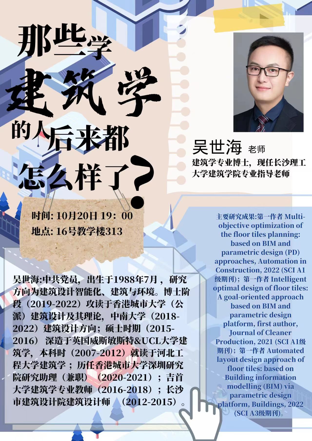 为了帮助2022级新生更好的认识建筑类专业,树立专业自信。10月20日晚19:00,建筑学院在16教313举办了2022级新生专业启蒙教育暨青年博士论坛第一讲,特邀青年博士吴世海做主题为“那些学建筑的人后来都怎么样了”的专题讲座,建筑学院党委副书记李家春、2022级辅导员郭恒以及2022级本科生参加。