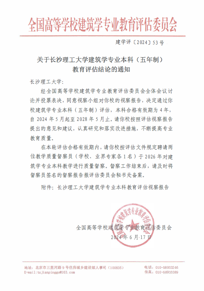 近日,全国高等学校建筑学专业教育评估委员会下发《关于威廉体育williamhill建筑学专业本科(五年制)教育评估结论的通知》(建学评[2024]53号),威廉体育建筑学专业本科(五年制)顺利通过专业评估,有效期为4年。