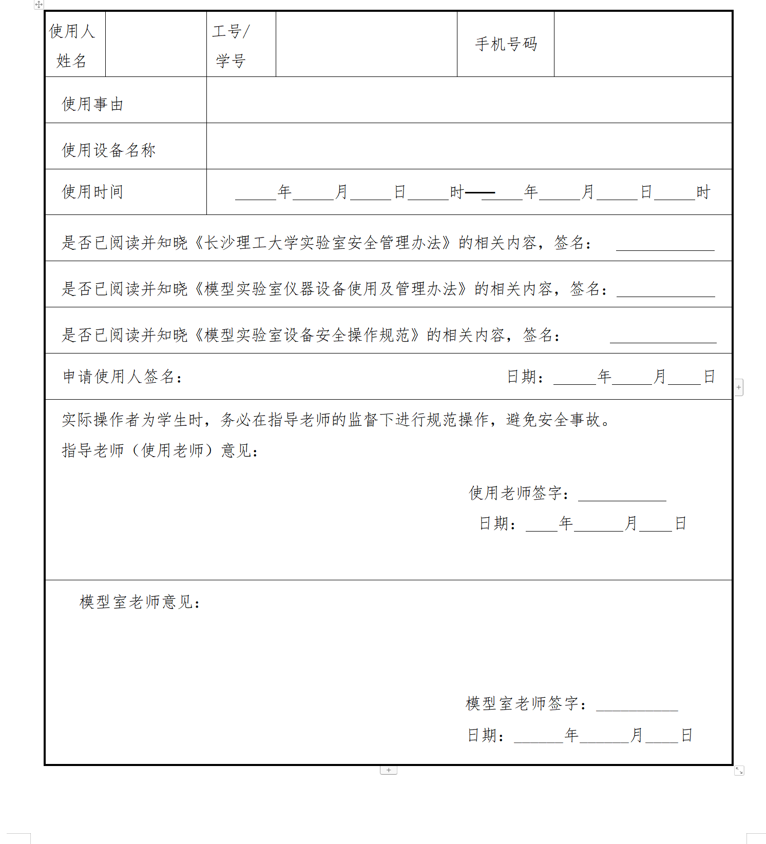 请确认是否已阅读并知晓《威廉体育williamhill实验室安全管理办法》、《威廉体育williamhill建筑学院模型实验室仪器设备使用及管理办法》、《建筑模型实验室设备安全操作规范》的相关内容,按要求填写表格。