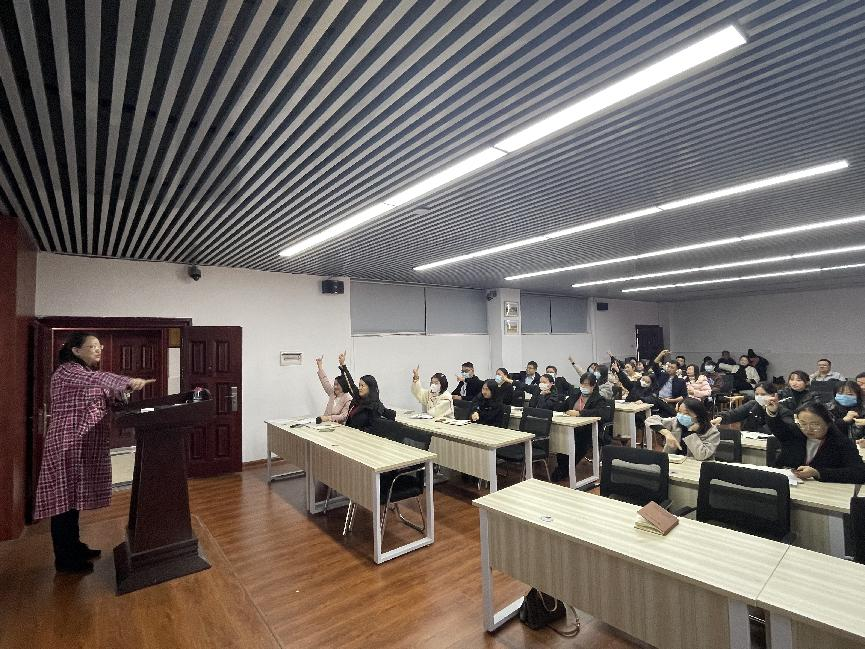 培训邀请了湖南师范大学心理健康教育中心主任余洁作题为“用爱和智慧为青春导航”的专题讲座。余洁从现今大学生心理健康教育面临的险峻形势、教师在心理健康教育中的重要作用、开展心理健康教育的注意事项三个层面逐次递进讲解,例举大量翔实的案例,通过开展趣味小游戏、心理测试等方式使得课堂生动有趣,给参会老师们敲响了加强学生心理健康教育的警钟。余洁语重心长地谈到:作为老师,须牢记心理危机干预流程,秉承危机干预的原则、人本主义的理念,在遵守法律规定的前提下,尊重学生隐私,切实保护学生的人格、尊严、人身安全不受侵犯,用积极的态度和科学的方法呵护学生成长。