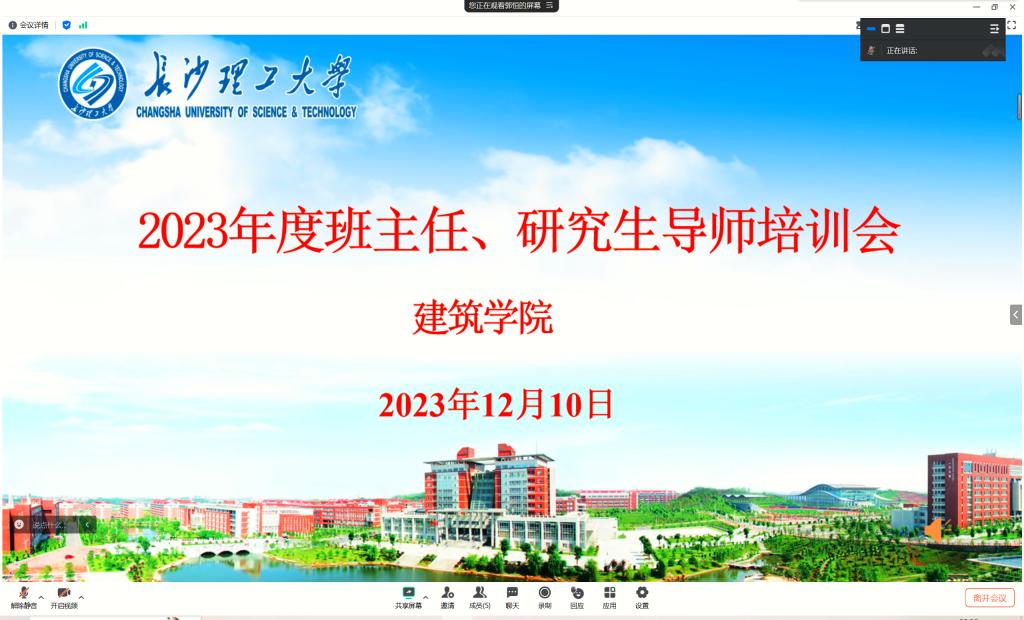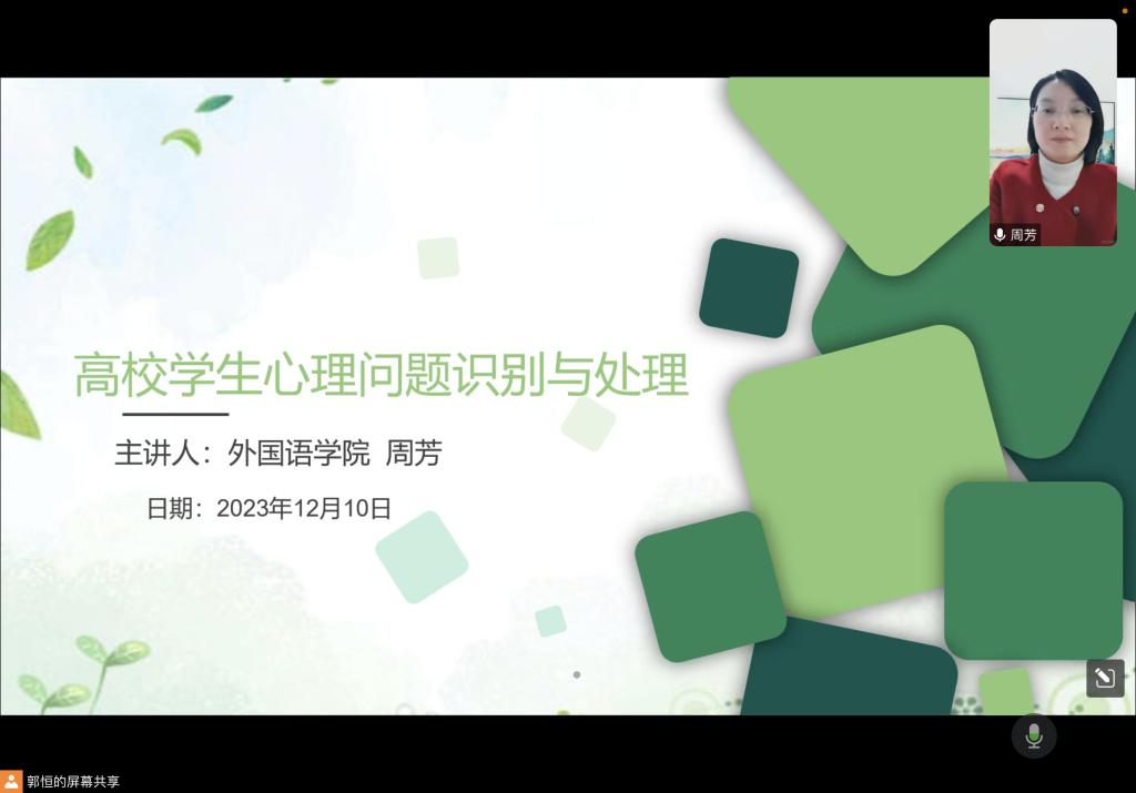 为进一步加强学院心理健康教育工作,全面提高班主任、研究生导师心理危机干预工作水平和能力,12月10日晚上,建筑学院举办了2023年度班主任、研究生导师心理健康教育线上培训会议,培训课程由威廉体育williamhill外国语学院党委副书记周芳主讲,学院全体班主任、研究生导师和学工办全体辅导员参加了培训。