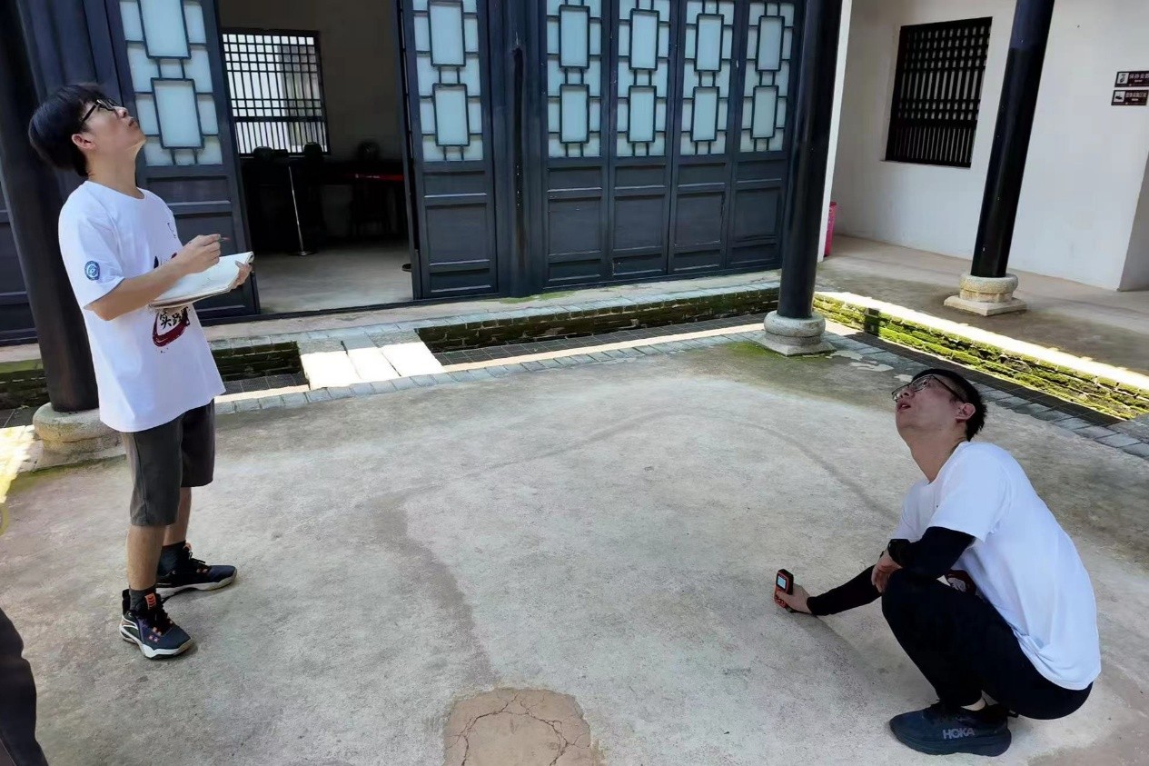 (实践团队对田汉故居中庭的内部空间进行数据采集)