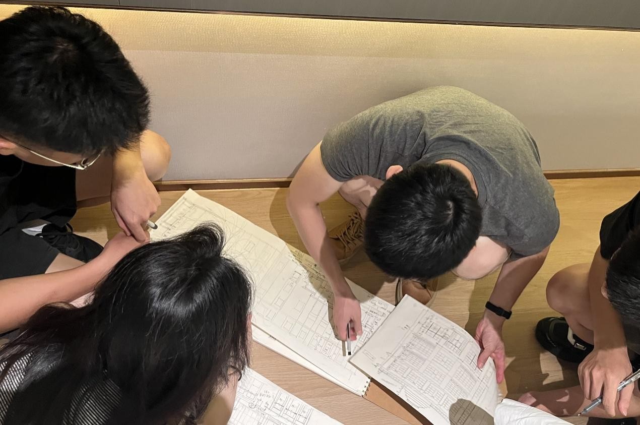 (实践团队讨论建筑测绘结果)