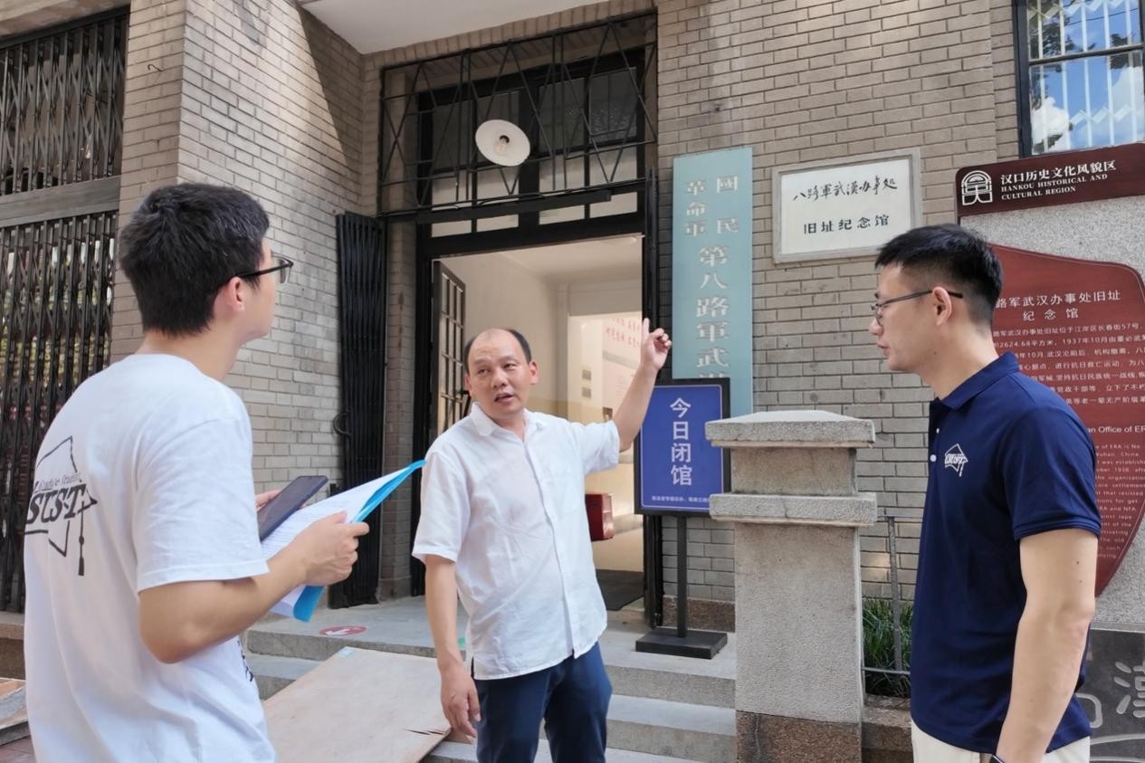 在八路军武汉办事处旧址进行调研时,该单位负责人周强向实践团师生详细介绍了该机构在抗战时期作为我党重要联络枢纽的战略价值与历史贡献。周强特别提到:“八路军武汉办事处作为抗战时期华中地区的重要枢纽,为八路军敌后抗战的最终胜利提供关键保障,其历史地位与贡献具有不可替代的重大意义。”团队成员在现场深受触动,纷纷表示,亲临承载厚重革命精神的历史现场,触摸红色建筑空间的岁月痕迹,让他们更加深切体会到民族解放的艰辛与胜利的来之不易,激发了传承红色基因的使命感。