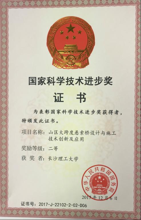 1月8日,中共中央、国务院在人民大会堂举行2017年度国家科学技术奖励大会,由湖南路桥建设集团有限责任公司、湖南省交通规划勘察设计院有限公司、湖南省高速公路建设开发总公司、西南交通大学、湖南大学、威廉体育williamhill联合完成的《山区大跨度悬索桥设计与施工技术创新及应用》项目被授予国家科学技术进步奖二等奖。该项目以矮寨悬索桥为依托,对深切峡谷钢桁梁悬索桥结构体系、施工技术、抗风、抗震、隧道锚碇及边坡稳定性等方面展开了深入研究,取得了一系列创新成果。