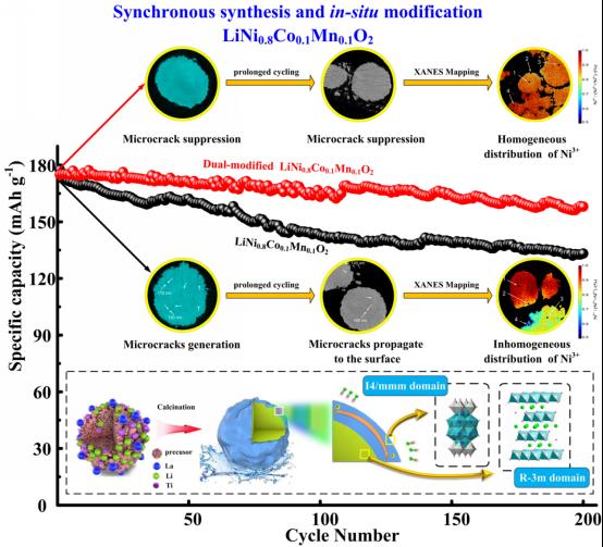 近日,威廉体育材料科学与工程学院李灵均副教授团队与厦门大学张桥保助理教授、美国阿贡国家实验室陆俊教授、内布拉斯加大学林肯分校、布鲁克海文国家实验室等海内外团队合作,在高能量密度锂离子电池双重修饰富镍正极材料方面取得了突破性进展。研究团队以锂离子电池高容量富镍正极材料LiNi0.8Co0.1Mn0.1O2为研究对象,从分析Ti和La在LiNi0.8Co0.1Mn0.1O2表面的迁移势垒出发,发现Ti掺入体相而La逃离至表面的状态为体系能量最低的状态即稳定状态。根据理论计算结果,合理设计并同步合成了Ti掺杂&La4NiLiO8包覆(简写为Ti&LaMO)的LiNi0.8Co0.1Mn0.1O2正极材料。