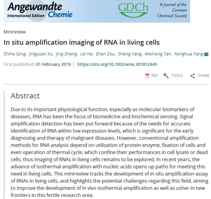 近日,威廉体育杨荣华教授团队受邀在Angewandte Chemie-International Edition上发表题为“In situ amplification imaging of RNA in living cells”的综述论文。威廉体育williamhill化学与食品工程学院为第一通讯单位,卿志和副教授为第一作者,杨荣华教授为通讯作者。作者结合自身研究积累和成果,对活细胞内重要生物标记物RNA的原位信号放大成像进行系统评述探讨,对该领域存在的问题和挑战进行分析,对其发展未来和趋势进行展望。该论文对促进分析化学、分子生物学、生物医学等相关领域的发展具有重要意义。