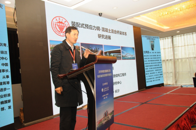 重庆大学刘界鹏教授以《装配式预应力钢-混凝土混合桥梁体系研究进展》为题作报告,分享了他在装配式组合桥梁体系方面的初步研究成果。