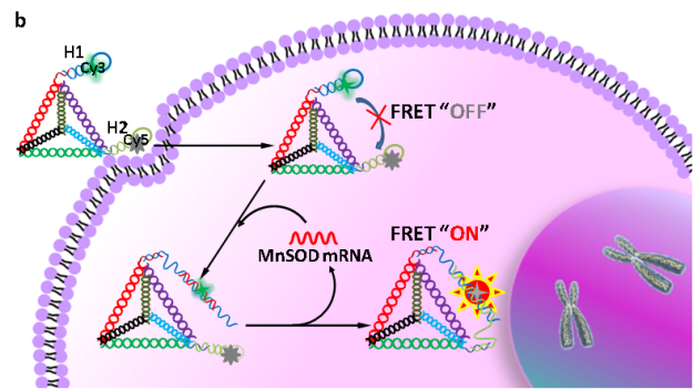 图1:(b) 根据碰撞效率理论,intra-CHA和free-CHA探针理化参数的推算;(b) intra-CHA探针对细胞内mRNA的原位信号放大成像过程示意图.