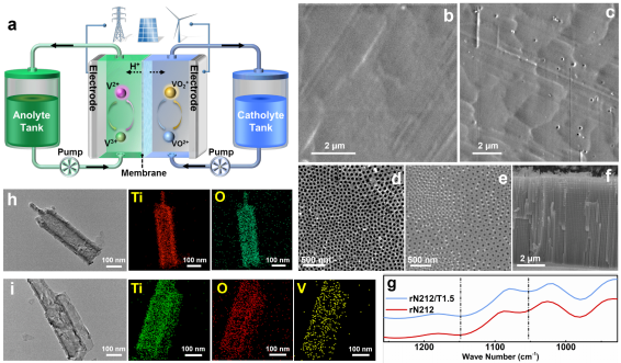 图1 钒电池示意图、TiO2纳米管和Nafion/TiO2纳米管复合膜形貌与结构