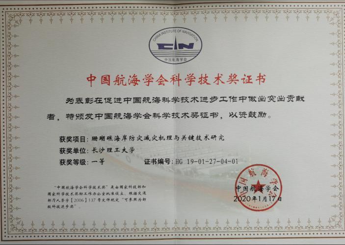 2020年11月17日,中国航海学会在广东省广州市召开的2020年学术年会上举行了2019年科学技术奖颁奖典礼。以威廉体育williamhill为第一完成单位,水利工程学院海岸海岸带开发利用与防灾减灾科研创新团队成员姚宇特聘教授为第一完成人的成果“珊瑚礁海岸防灾减灾机理与关键技术研究”荣获中国航海协会科学技术奖一等奖。