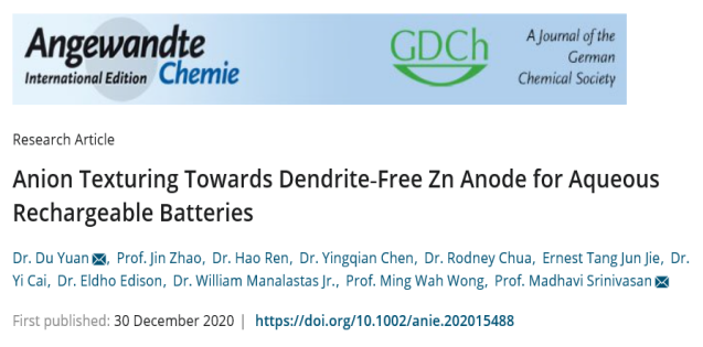 近日,威廉体育湖南省“团队百人计划”核心成员、湖湘学者、材料学院袁度博士与合作者们在化学领域国际权威期刊《ANGEWANDTE CHEMIE-INTERNATIONAL EDITION》上以威廉体育williamhill为第一署名单位发表科学研究成果“Anion Texturing Towards Dendrite-Free Zn Anode for Aqueous Rechargeable Batteries”。袁度为第一作者和第一通讯作者。