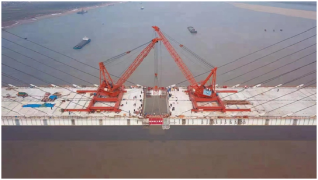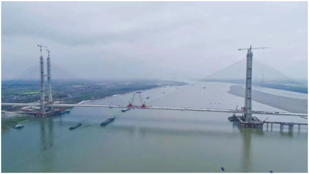 赤壁长江大桥为主跨720米的双塔双索面结合梁斜拉桥,主梁采用混凝土板和钢主梁上下结合的布置。结合梁斜拉桥受力复杂,设计与施工难度较大,此前世界上已建成的该类型斜拉桥的主跨不超过660米,而赤壁长江大桥一举突破了700米的大关。