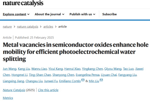 论文信息:Wang, J., Liu, K., Liao, W. et al. Metal vacancies in semiconductor oxides enhance hole mobility for efficient photoelectrochemical water splitting. Nat. Catal. (2025). https://doi.org/10.1038/s41929-025-01300-1