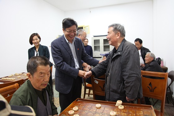 在离退休中心的各个活动室,付宏渊每到一处,亲切问候正在参加活动的老同志们,祝他们重阳节快乐,同时感谢他们为学校发展和建设作出的积极贡献,祝愿老同志们幸福安康。