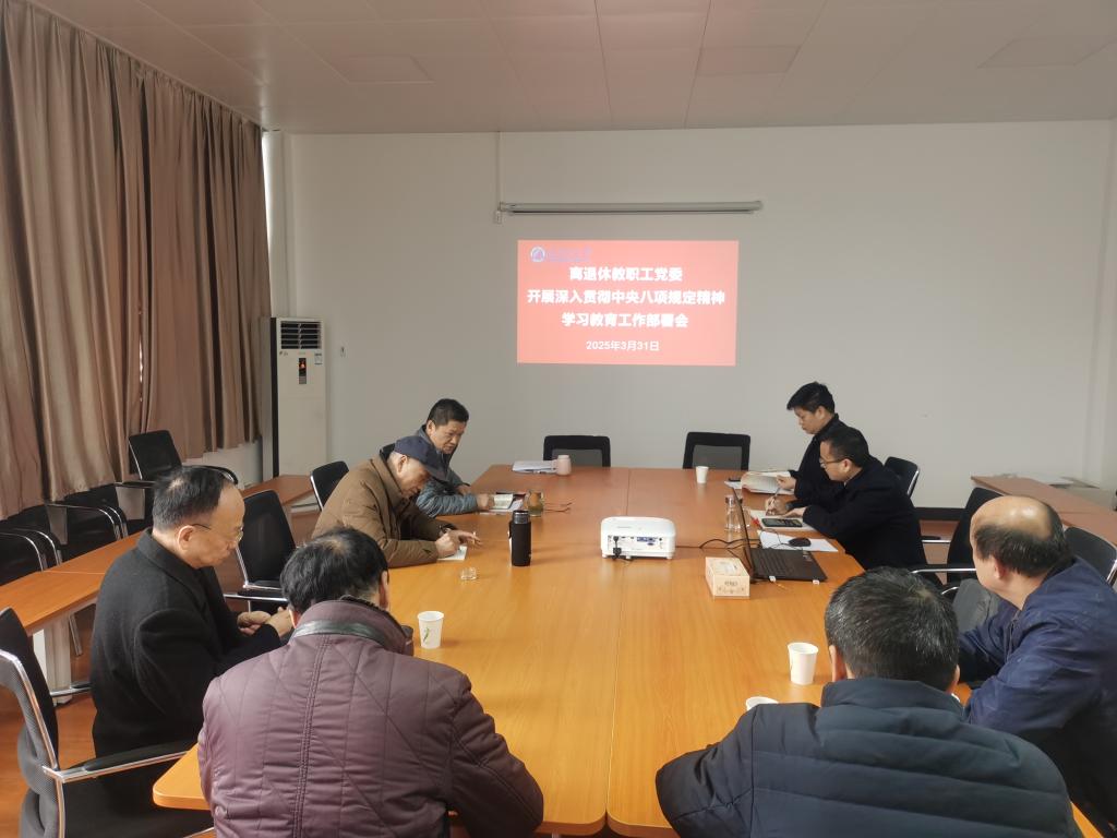 3月31日上午,在金盆岭校区五教408会议室召开离退休教职工党委会议,深刻领悟习近平总书记关于深入贯彻中央八项规定精神学习教育的重要讲话和重要指示精神,传达学习中央、省委党的建设工作领导小组会议精神,认真学习贯彻学校党委《开展深入贯彻中央八项规定精神学习教育实施方案》精神,研究部署离退休教职工党委学习教育安排。