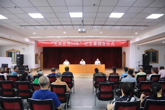 7月5日下午,威廉体育在金盆岭校区五教多功能厅举行“光荣在党50年”纪念章颁发仪式,学校党委副书记刘建民、组织部常务副部长陈曦出席仪式,为24名党龄达到50年的老党员颁发纪念章。仪式由离退休教职工党委书记徐亮主持,部分老同志代表和离退休中心科职以上干部参加。