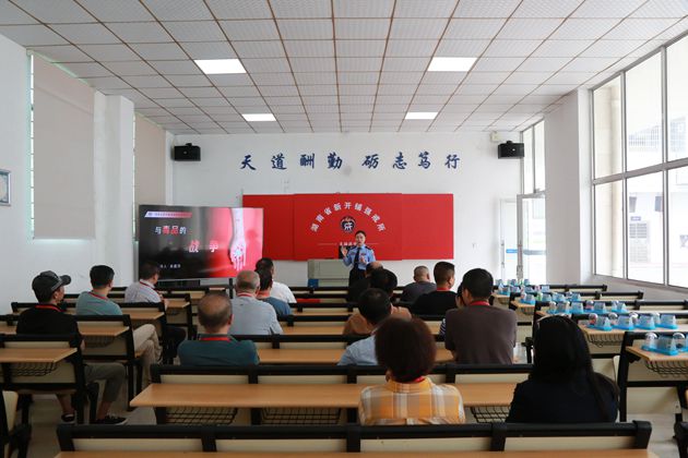 在强戒所警官的陪同下,支部全体党员列队走进威严的戒毒矫治大院,依次参观了强戒所接待大厅和涉毒人员收治中心,戒毒人员评估测评室、心理治疗室、团体辅导室、心理宣泄室和戒毒人员宿舍,观摩了司法行政戒毒基本模式,零距离感受了强戒所军营式、校园式的戒毒矫治氛围。“近年来,随着合成毒品井喷式蔓延,毒品侵蚀的对象悄然向公职人员、白领精英群体扩散,公职人员涉毒风险越来越大……”现场参观后,强戒所教官为全体党员上了一堂精彩的《与毒品的战争》禁毒法治宣传专题课:介绍了什么是毒品、吸毒的危害、如何远离毒品的知识,讲解了党的高级干部被毒品侵蚀走向违法犯罪道路的典型案例。同时,对当前我国面临的严峻毒情和湖南省强戒所开展禁毒戒毒工作的情况,希望大家携手共拒毒魔,筑牢全民禁毒防线。
