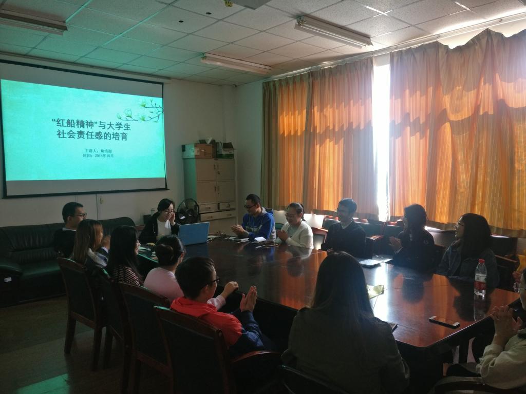 焦浩源同志首先从“红船”的来源开始讲起,带领2017级全体学生党员和积极分子回顾了“红船”的历史及其意义。之后对“红船精神”与“红色文化”进行了深入解读,对“红船精神”中的三种精神即:开天辟地、敢为人先的首创精神;坚定理想、百折不挠的奋斗精神;立党为公、忠诚为民的奉献精神进行了讲解。她认为这三种精神是中国革命精神之源,也是‘红船精神’的深刻内涵,“我们要高举‘三个代表’重要思想伟大旗帜,始终保持党的先进性,就必须永远铭记我们党的‘母亲船’,重温红船的历史沧桑,在继承和弘扬‘红船精神’中永葆党的先进性,进一步激发为中国特色社会主义事业奋斗的信念和力量。”最后她指出现代大学生应该通过学习红船精神,培养自己的社会责任感:坚持敢为人先,激发大学生树立首创精神;坚定理想信念,引导大学生弘扬奋斗精神;坚守民本情怀,引导大学生传承奉献精神,来进行大学生社会责任感的培育。