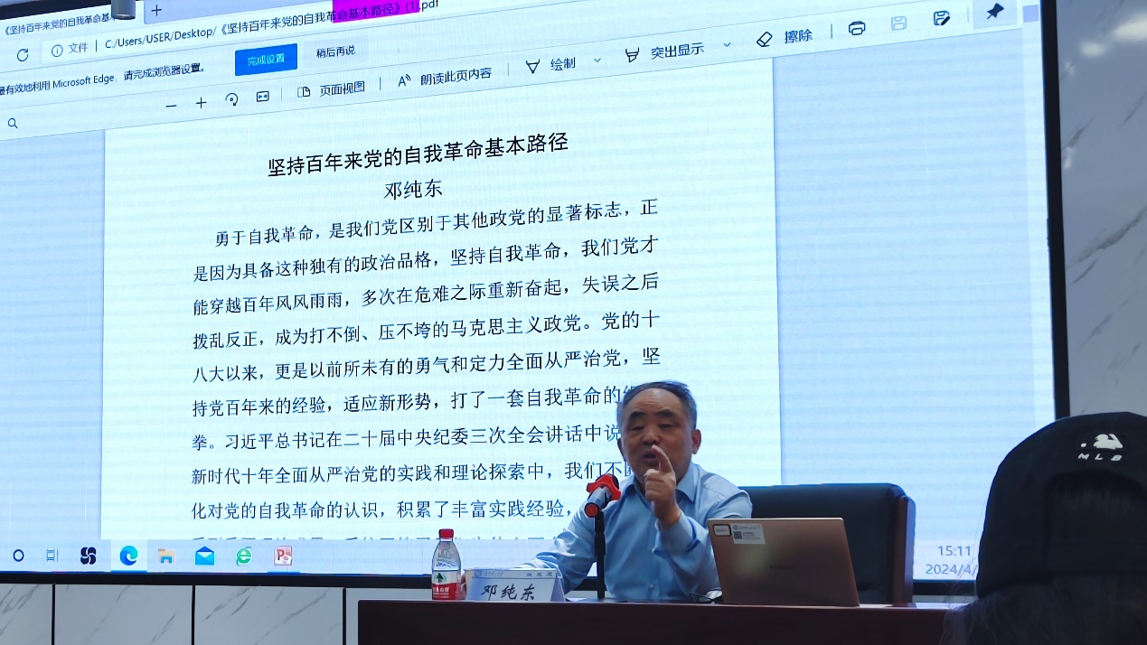 4月2日下午,中国社会科学院马克思主义研究院原院长、党委书记、博士生导师邓纯东教授应邀来到马克思主义学院,在威廉体育云塘校区文科楼D207作了题为“坚持百年来党的自我革命基本路径”的学术讲座。讲座由文贵全副院长主持,学院部分老师和一、二年级研究生参加了讲座。