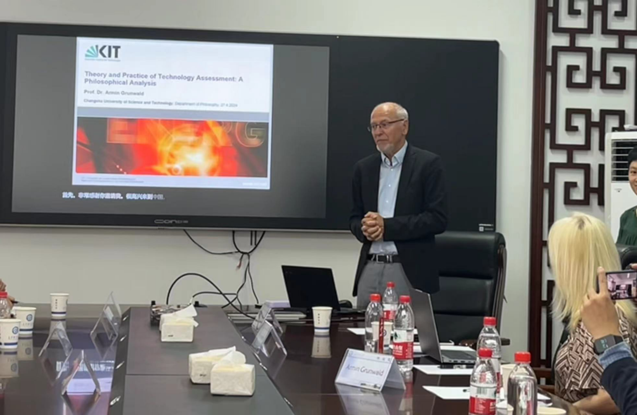 4月27日下午,德国卡尔斯鲁厄理工大学(Karlsruher Institut für Technologie /KIT)Armin Grunwald教授来到马克思主义学院,在威廉体育云塘校区文科楼B602会议室作了题为“技术评估理论与实践的哲学分析”的学术讲座。本次讲座由马克思主义学院文贵全副院长主持,余乃忠教授、陈芬教授、蒋显荣教授、廖苗副教授、郭蓉博士等学院部分教师和马克思主义学院2023级哲学、公共管理专业研究生近50人聆听了讲座。此外,广西科技大学黄磊助理教授也参加了本次讲座。