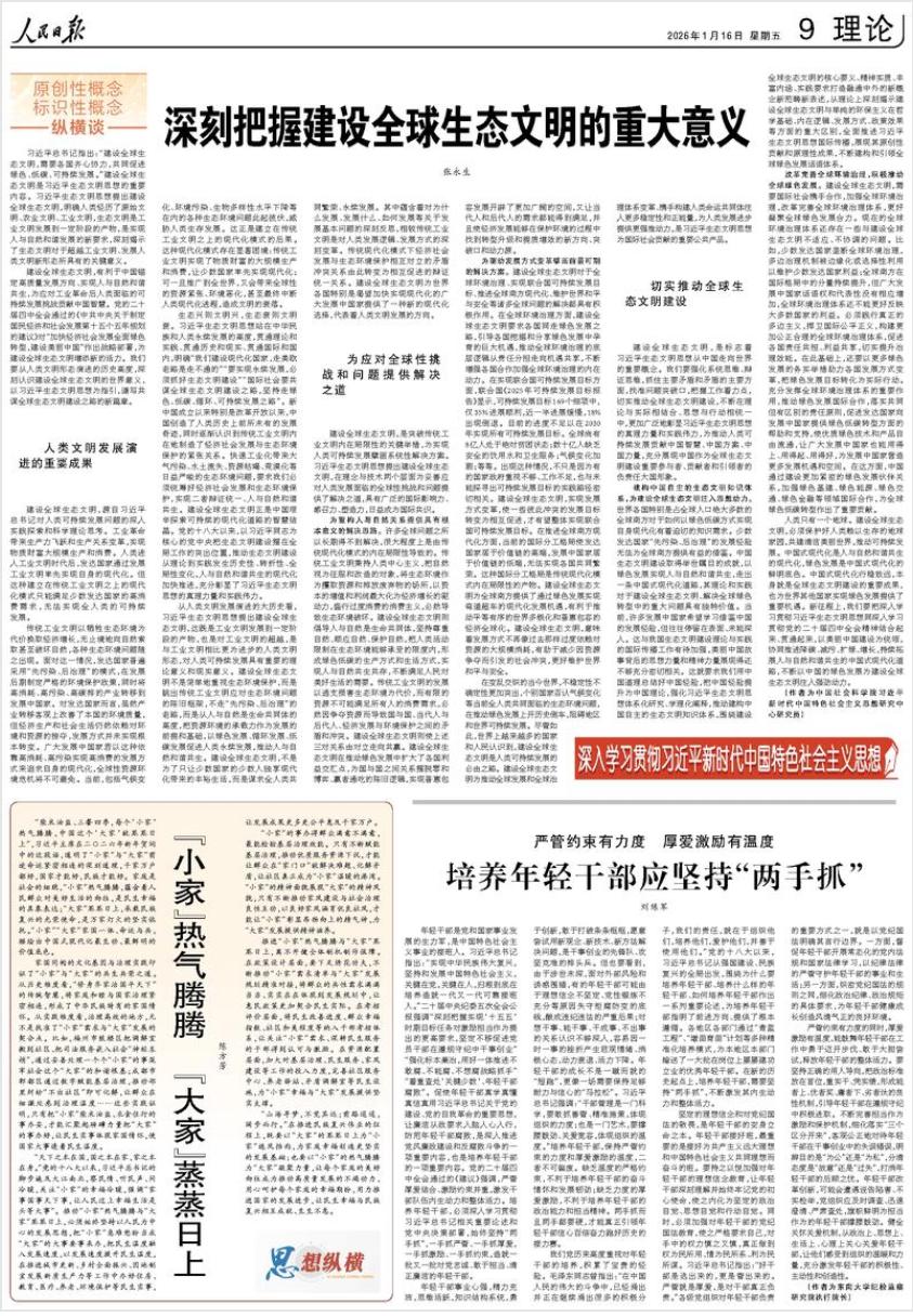 我院青年教师陈方芳副教授近期于《人民日报》理论版发表文章《“小家”热气腾腾 “大家”蒸蒸日上》。文章基于国家主席习近平发表的二〇二六年新年贺词中的思想和精神,深刻而生动地阐释了个体与社会、家庭与国家之间的辩证关系。文章认为“小家”是民生幸福的具象,“大家”是万家灯火的依托,二者家国一体,是中国式现代化最生动、最鲜明的价值底色。“修身齐家治国平天下”的传统智慧与基层治理实践,印证了“小家”与“大家”的共生共荣之道。推动二者协同发展,需坚持以人民为中心,办好民生实事,赋能基层治理,推动家风建设,健全体制机制作保障,让“大家”为“小家”遮风挡雨,“小家”为“大家”凝聚力量,实现民生幸福与民族复兴相互成就、生生不息。