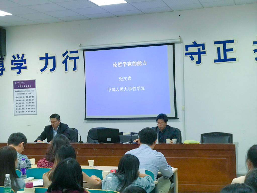 2018年10月12日下午14点,中国人民大学哲学院博士生导师、张文喜教授,应邀在威廉体育云塘校区文科楼C202报告厅进行了题为“论哲学家的能力”的学术讲座。威廉体育马克思主义学院陈万球院长、张明海副院长、部分教师和全体研究生聆听了此次讲座。讲座由马克思主义学院院长陈万球教授主持。