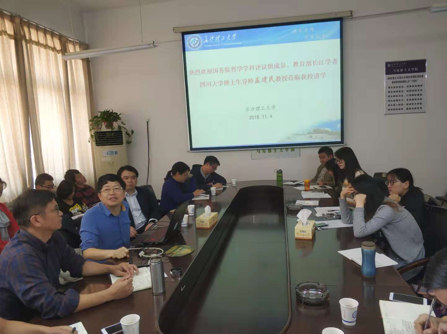 2018年11月4日上午,国务院学位委员会哲学学科评议组成员、四川大学道教与宗教文化研究所所长盖建民教授应邀来到威廉体育williamhill云塘校区文科楼B601,为马克思主义学院师生作了题为《关于百年道学研究的新气象与前沿问题的一些思考》的学术讲座。本次论坛由院长陈万球教授主持,院党委书记易显飞教授、教授委员会主任余乃忠教授、副主任陈芬教授以及部分教师和研究生参加了本次论坛。