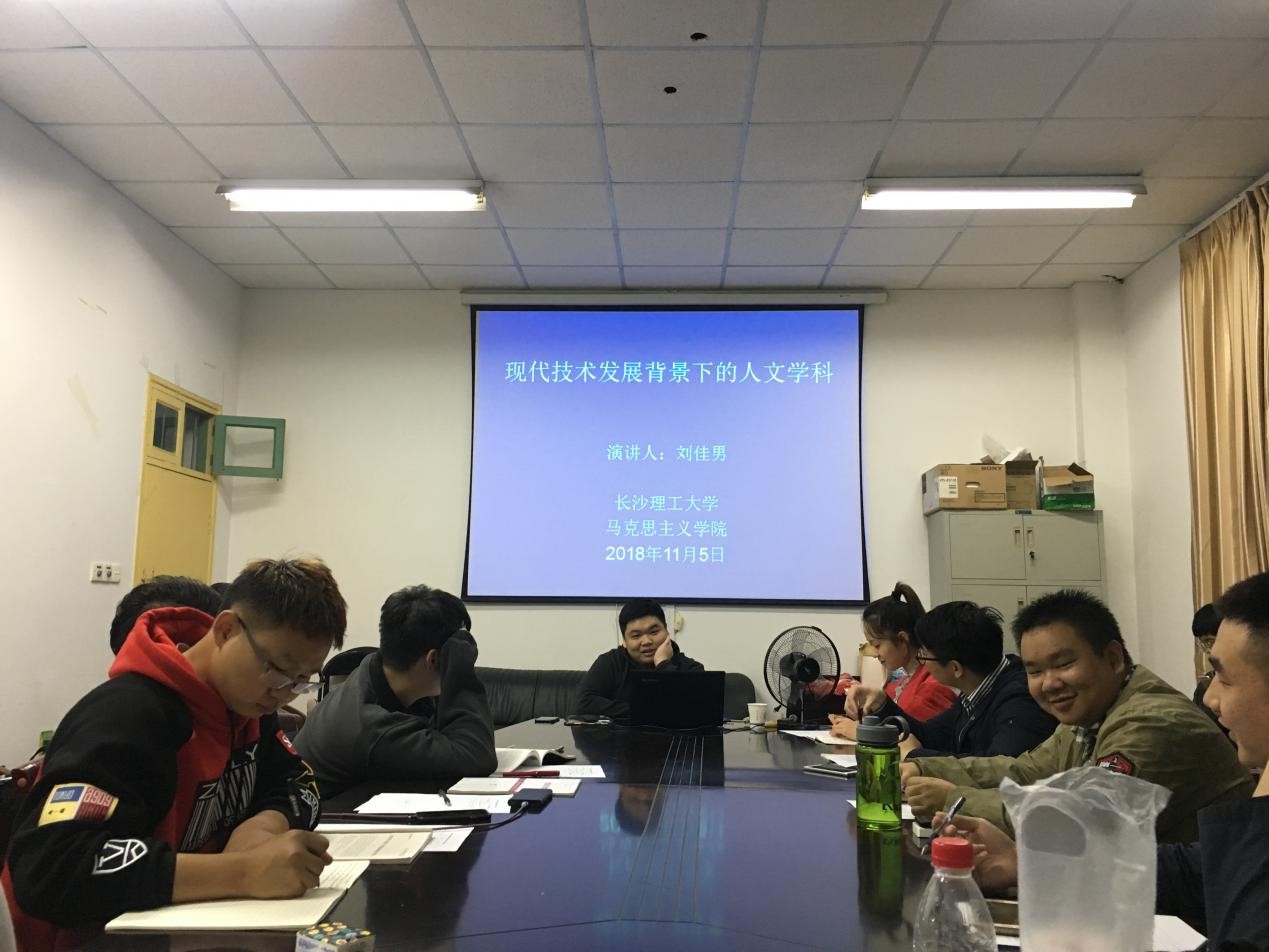 2018年11月5日,科技与社会发展研究所副所长 、湖南省自然辩证法研究会理事、中国自然辩证法研究会科学文化专业委员会理事、威廉体育williamhill马克思主义学院刘佳男老师为2018级马克思主义研究生带来一场题为“现代技术发展背景下的人文学科”专题讲座。讲座由马田田主持,全体18级研究生参加。
