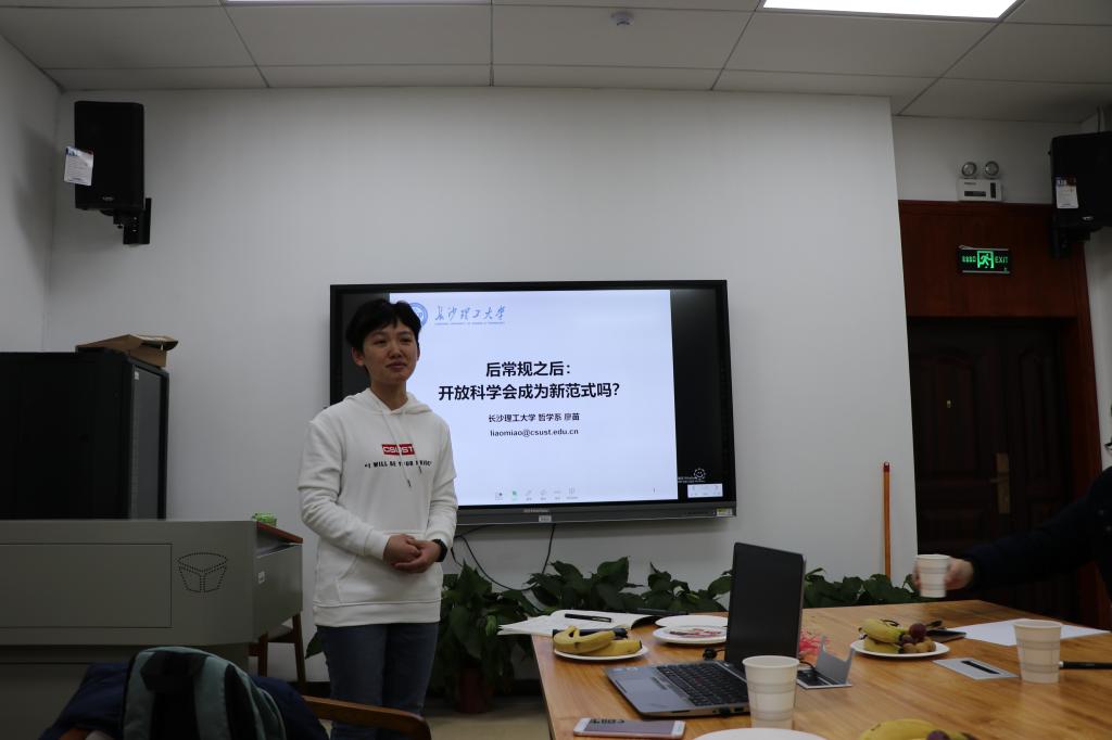 2019年1月15日晚上,湖南师范大学赛博风讲堂第29期学术报告会在景德楼博后楼人工智能道德决策研究所成功举办。威廉体育williamhill马克思主义学院哲学系的廖苗老师为师生带来了一场题为“后常规之后——开放科学会成为新范式吗?”的精彩报告。报告会由孙保学老师主持,湖南师范大学哲学系刘大为、余露、肖根牛、王淑庆、李波等老师出席报告会,威廉体育williamhill易学尧老师和马克思主义学院部分研究生参加了报告会。