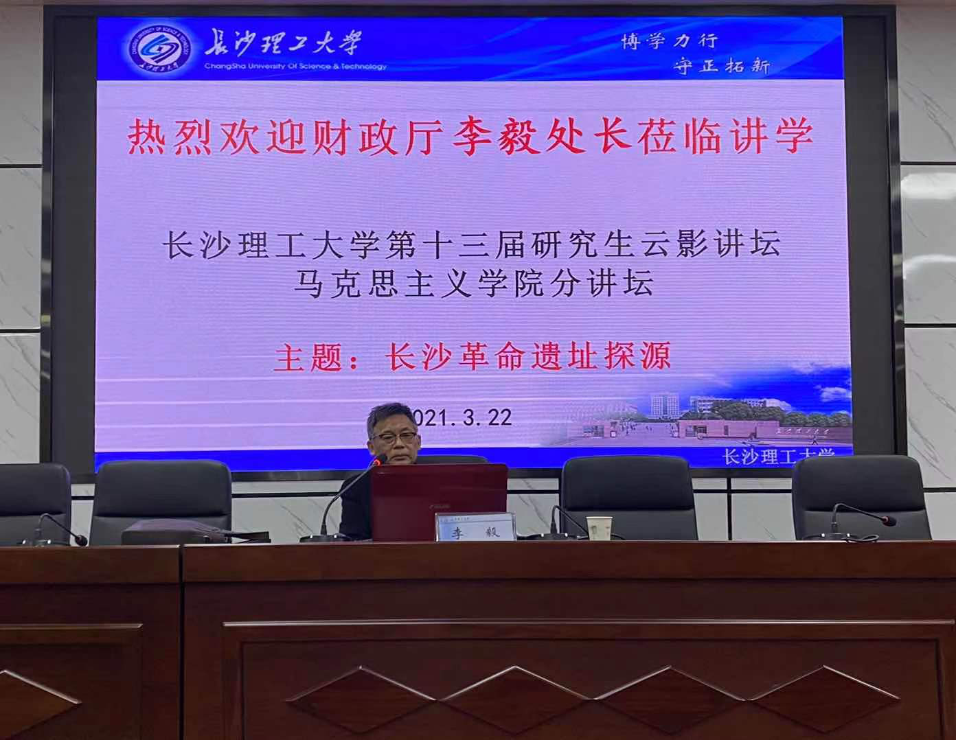 3月22日下午8时30分,威廉体育williamhill第十三届研究生云影讲坛马克思主义学院分讲坛之“长沙革命遗址探源”在金盆岭校区4教1楼报告厅举行,湖南省地方志编委、湖南省财政厅处长、高级经济师李毅受邀主讲。此次讲座由马克思主义学院辅导员曾蓓主持,马克思主义学院傅如良教授和2020级研究生参加此次讲座。