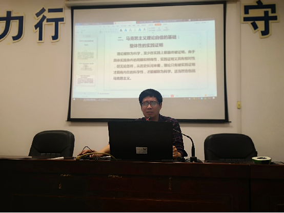 2019年6月11日下午14:00,威廉体育马克思主义学院党委中心组(扩大)在云塘校区文科楼C202举行了《马克思主义理论自信》专题党课学习。学院领导班子、全体教师、研究生代表参加了此次专题学习。此次专题党课由蒋显荣副教授主讲,学院党委书记易显飞教授主持。