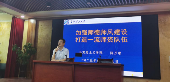 上午,学院教师到达汨罗市长乐镇以后,随即召开全院大会。陈万球作了题为《加强师德师风建设 打造一流师资队伍》的主题报告。一是传达教育部全国马克思主义学院综合治理工作会议精神,二是学习《教育部关于在教育系统开展师德集中学习教育的通知》精神,三是全面部署马克思主义学院贯彻落实教育部师德师风建设暨师德集中学习教育要求的各项工作。陈万球详细解读了教育部部署的“思想铸魂”“固本强基”“清朗净化”“教育提升”“警钟长鸣”“典型赋能”六大行动,强调学院必须高度重视,进一步提高站位,明确责任,对当前各地师德师风建设领域中存在的突出问题保持高度警醒和戒备,对照习近平总书记谆谆教导和教育部工作要求,加强学习,防微杜渐,严格查纠,确保学院不发生师德师风问题。陈万球对学院开展师德集中学习教育的组织领导、工作机制、学习内容以及各阶段学习教育工作重点进行了部署,同时结合学院实际,特别就师德师风与意识形态两个重点领域宣讲了相关纪律规定和注意事项,警醒老师们在处理师生关系时准确定位师生角色,正确把握关系边界,强化微信群、QQ群、微信朋友圈的政治意识和规矩意识,谨慎点赞和转发各种信息。陈万球表示,马克思主义学院一定要坚持政治引领,强化师德学习教育,坚持师德违规“零容忍”。