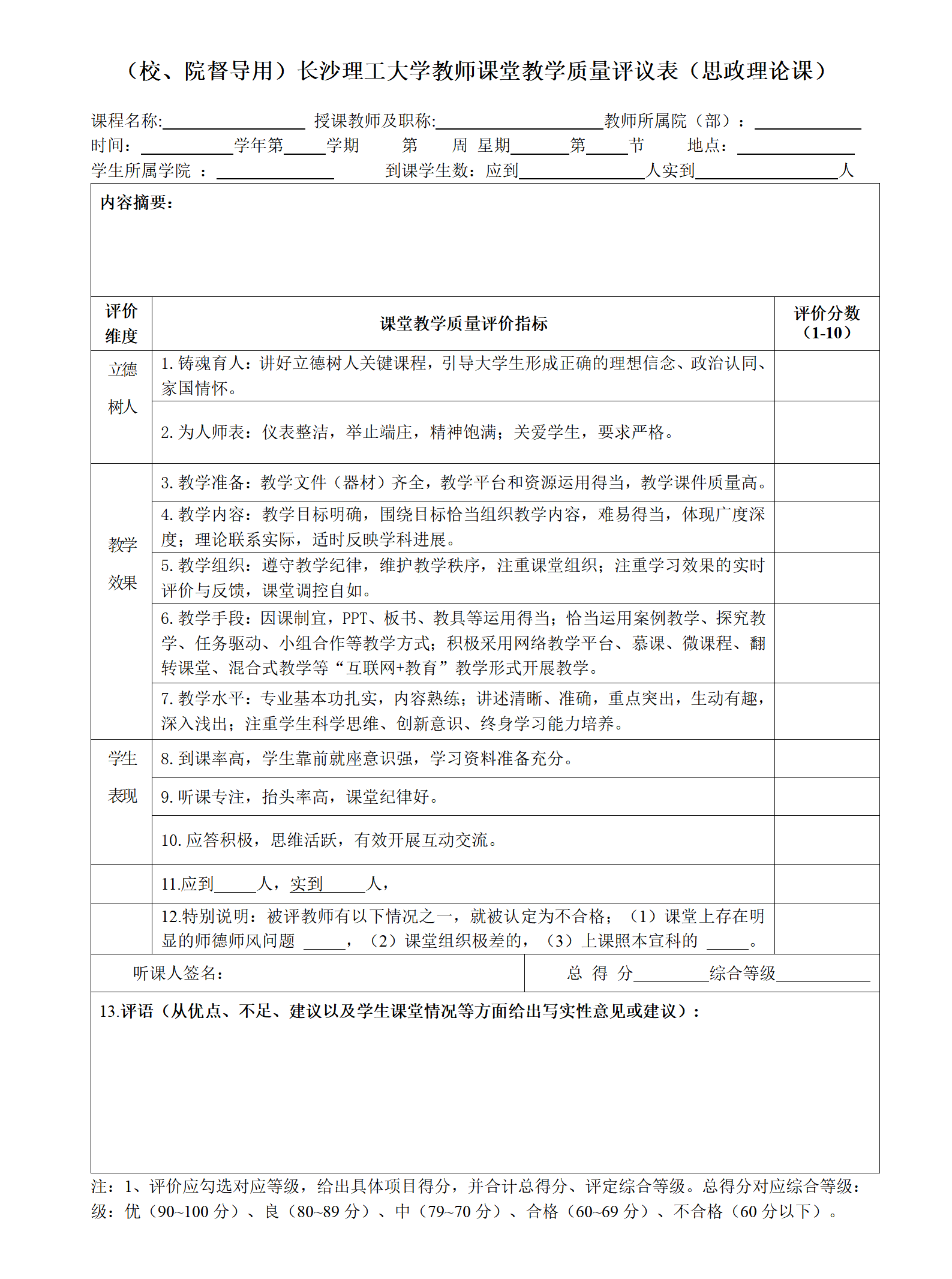 威廉体育williamhill教师课堂教学质量评议表(思政理论课)