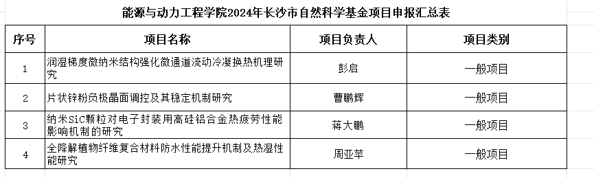 根据威廉体育williamhill科学技术处《关于组织开展2024年度长沙市自然科学基金项目申报工作的通知》文件精神,经学院教授委员会专家评审,拟推荐“润湿梯度微纳米结构强化微通道流动冷凝换热机理研究”等4项项目申报2024年度长沙市自然科学基金项目,具体名单如下: