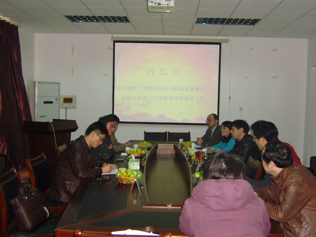 会议由黄竹青院长主持。她首先代表能动学院对长沙锅炉厂有限责任公司领导来学院开展产学研合作对接表示热烈的欢迎和衷心的感谢,并简要介绍了学院产学研开展的基本情况,随后,彭益成董事长就双方合作的内容和长沙锅炉厂有限责任公司具已备的条件和所做的前期工作作了详细的介绍。双方合作主要在两个方面:一是就维修改造、部件加工组建共同团队开发电力市场;二是就太阳能热发电项目组建团队共同研究。接着,大家围绕这两个主题进行了广泛的交流和探讨,并对工作的开展作了整体布置和详细安排,以保证双方合作有序发展,收到实效。