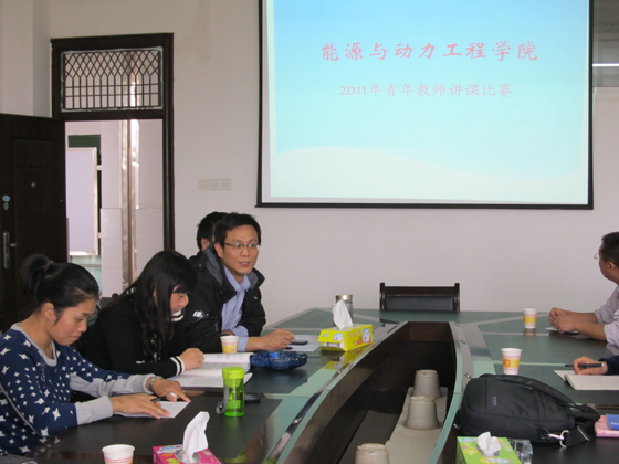 2011年11月1日下午,能源与动力工程学院青年教师讲课比赛预赛在云塘校区工科一号楼A-413举行。刘智敏、刘代飞、邓巧林、邹淑云四位青年教师参加了本次讲课比赛。本次比赛旨在鼓励广大青年教师积极投身教学工作,搭建青年教师互相交流、学习和展示教学水平的平台,加强青年教师培养,改进教学方法,增强教学能力。