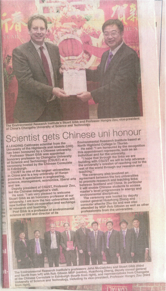 代表团在英国爱丁堡中国领事馆与英国高地与岛屿大学举行合作协议签约仪式,爱丁堡中国领事馆副领事张华忠先生及英国国会议员Rob Gibson先生参加了签约仪式。邹宏如校长和陈冬林院长分别向英国高地岛屿大学环境研究院Stuart Gibb教授与John McClatchey教授介绍了学校与能源与动力工程学院的基本情况,同时Stuart Gibb教授向代表团介绍了英国高地与岛屿大学环境研究院所从事的研究工作。此外,在爱丁堡中国领事馆副领事张华忠及苏格兰国会议员Rob Gibson的见证下,威廉体育williamhill代表团与英国高地与岛屿大学代表团举行了客座教授聘任仪式,邹如宏副校长向英国高地与岛屿大学Stuart Gibb教授颁发了客座教授证书,签署了威廉体育williamhill与英国高地与岛屿大学合作备忘录。仪式结束后,代表团与英国高地与岛屿大学就研究生联合培养、科研合作与互派访问学者等进行了深入而广泛的交流,并对研究生联合培养协议进行了充分地沟通与探讨,双方希望尽快启动研究生联合培养。威廉体育williamhill和英国高地与岛屿大学的交流与合作洽谈事宜很快被当地主流媒体进行了报道。