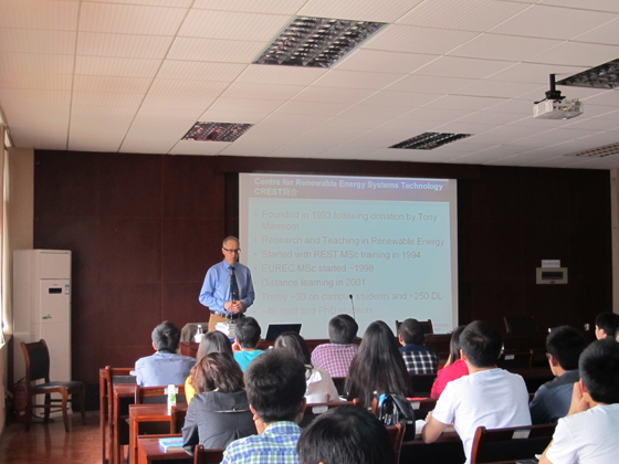 4月15日上午,Simon教授在工科一号楼A-428多功能报告厅作了题为“CREST and Wind Power Research”的学术报告。相关专业的教师、研究生、本科生与会。报告会由向健平教授主持。她首先代表师生对Simon教授的到来表示热烈欢迎,并简要介绍了Simon教授的学术成就和工作研究经历。报告会上,Simon教授结合自己的经历,介绍了英国帝国理工大学、爱丁堡大学、拉夫堡大学的教学模式,详细说明了国外高校的研究生培养方案和国际合作办学经验,重点讲解了欧洲高校在新能源方面的研究前沿与发展趋势以及风力发电技术,并介绍了其研究组的研究成果和研究方向。