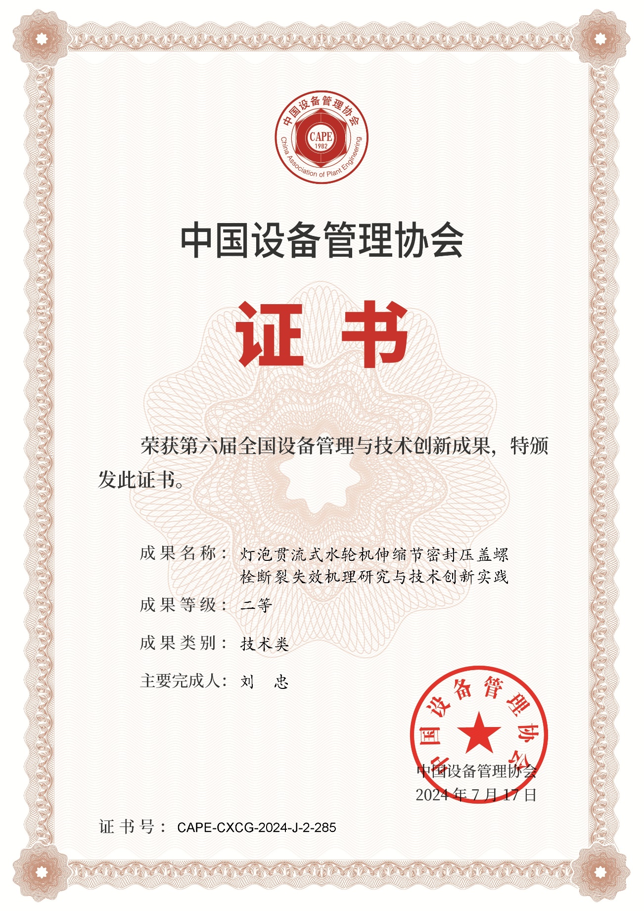 7月17日至19日,由中国设备管理协会主办的第六届全国设备管理与技术创新成果交流大会在陕西省西安市举行。国家部委有关部门领导,中国设备管理协会及有关省(市)、行业设备管理协会负责人,第六届设备管理与技术创新成果单位负责人及创新成果主要完成人代表等1200余人参加会议。由中国水电顾问集团桃源开发有限公司和我院刘忠教授团队共同完成的“灯泡贯流式水轮机伸缩节密封压盖螺栓断裂失效机理研究与技术创新实践”荣获第六届全国设备管理与技术创新成果二等奖。