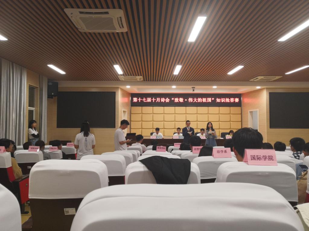 为了提高大学生的综合素质,增强大学生对祖国和学校的了解和热爱,2020年10月20日晚7点,第十七届十月诗会“致敬·伟大祖国”知识抢答大赛复赛在云塘校区理科楼A200隆重举行。