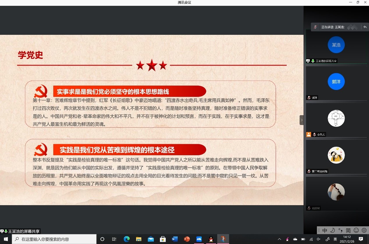 2021年2月26日下午一点半,能动学院本科生第一党支部顺利开展《学党史•述初心•担使命》PPT分享活动。本次活动的形式为线上分享,参加活动的是能动学院本科生第一党支部所有党员同志,共43名。