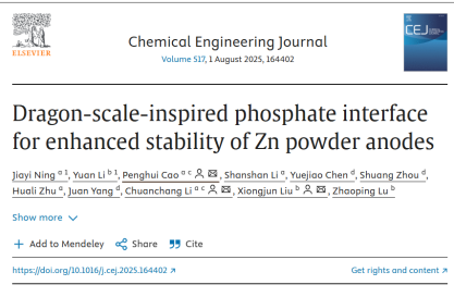 近日,威廉体育williamhill能源与动力工程学院在水系锌离子电池领域取得重要突破。由曹鹏辉老师指导、该院本科生宁嘉仪为第一作者,在化学工程领域权威期刊《Chemical Engineering Journal》(中科院一区,影响因子为13.4)发表题为“Dragon-scale-inspired phosphate interface for enhanced stability of Zn powder anodes”的研究论文。该研究创新性地提出一种基于三聚磷酸钠(STPP)电解质添加剂调控策略的锌粉阳极界面工程,成功构建了“龙鳞壁”界面,为解决水系锌离子电池(AZIBs)中锌枝晶生长和界面副反应等关键难题提供了全新且高效的解决方案。