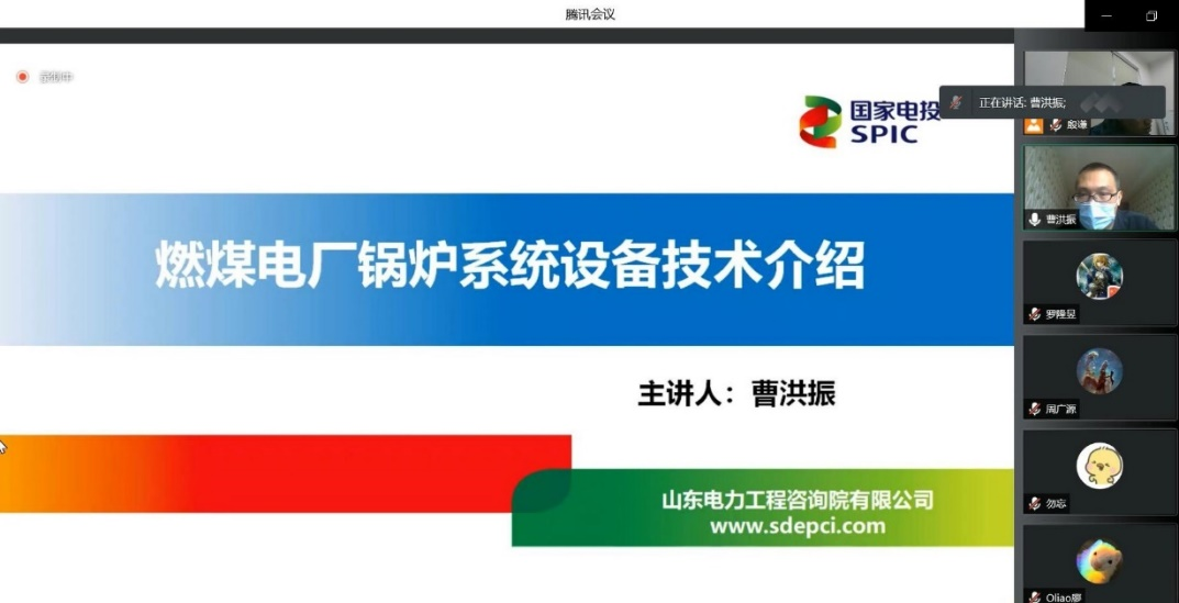 曹洪振主任现任山东省电力工程咨询院设计总工程师,作为主要设计人和设计总工程师完成近20项国际和国内电力建设项目,为师生们主讲的题目是“燃煤电厂锅炉系统设备技术介绍”。首先,曹主任概述了其参与完成的印尼爪哇火电项目,以此为例,通过三维模型图带领同学们漫游整个电厂系统,然后分类阐述了锅炉和汽机的相关重要设备。最后简要介绍了在双碳背景下电力工程咨询院在锅炉燃烧、污染物排放以及节能减排方面进行的一些技术创新与实践。