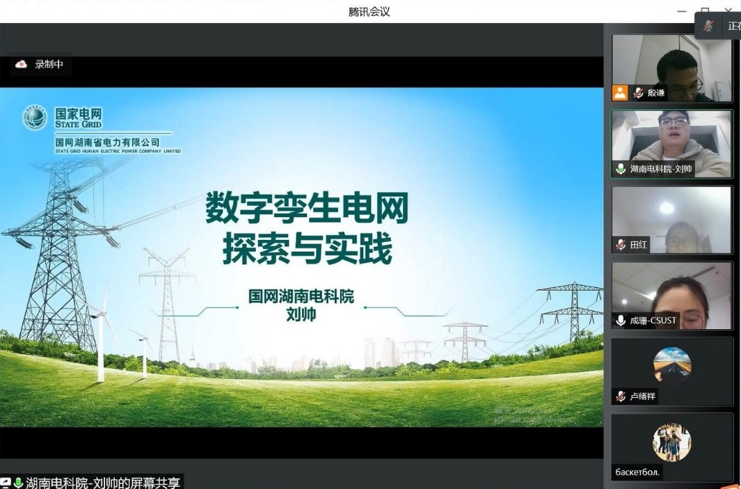 刘帅高工现任国网湖南电科院物联网应用技术中心数据分析挖掘组组长,从事电网数字化工作,为师生带来了“数字孪生电网探索与实践”的报告。他首先介绍了数字孪生的概念和背景,然后详细阐述了湖南电力公司在电网数字孪生试点工作中的具体内容,及其对支撑政府决策、推进能源转型、服务经济民生及夯实供电能力等方面的实践,最后对数字孪生技术在电网中的远景目标进行了展望。