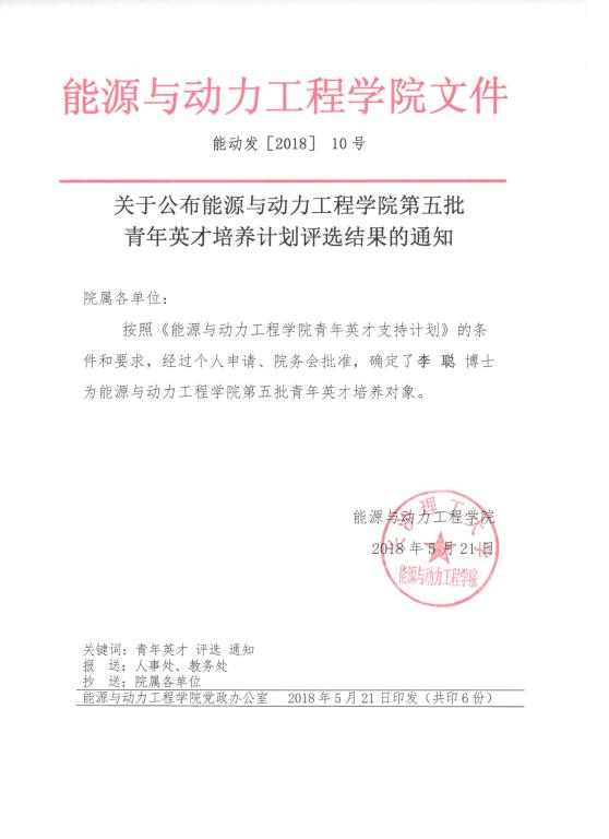 关于公布能源与动力工程学院第五批青年英才培养计划评选结果的通知