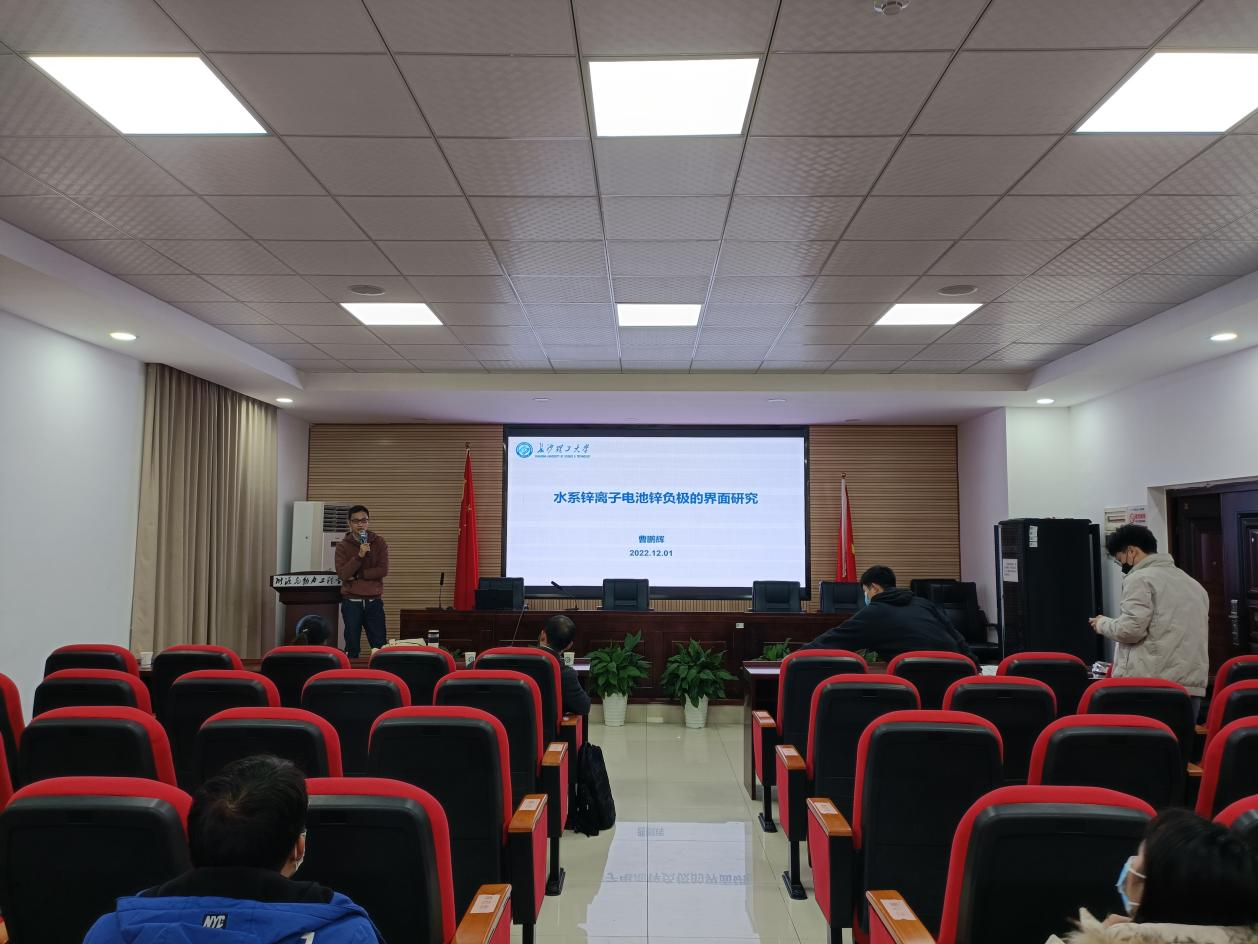 曹鹏辉报告的内容是水系锌离子电池锌负极界面的研究,他指出水系锌离子电池的负极、正极、电解液存在的一些关键问题,对水系锌离子电池Zn负极进行了研究设计。