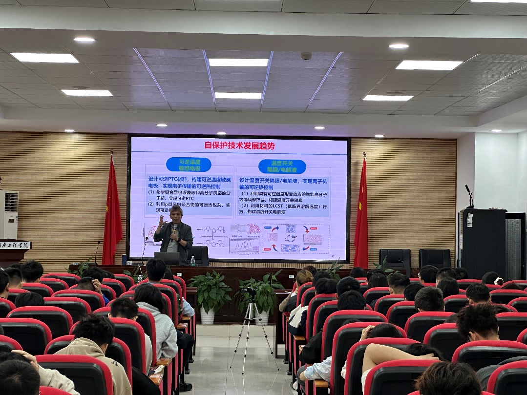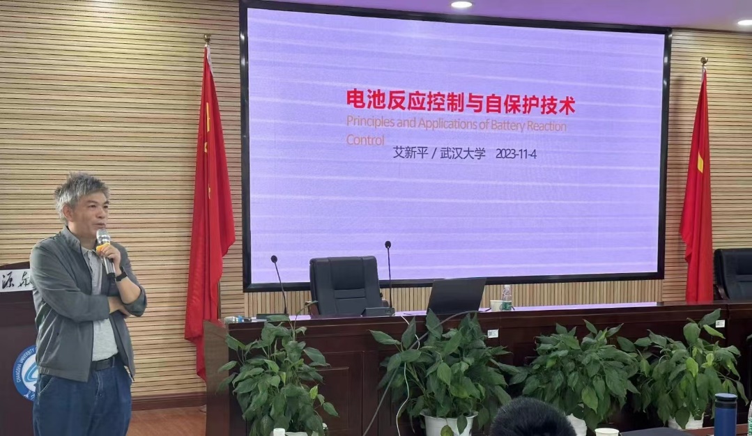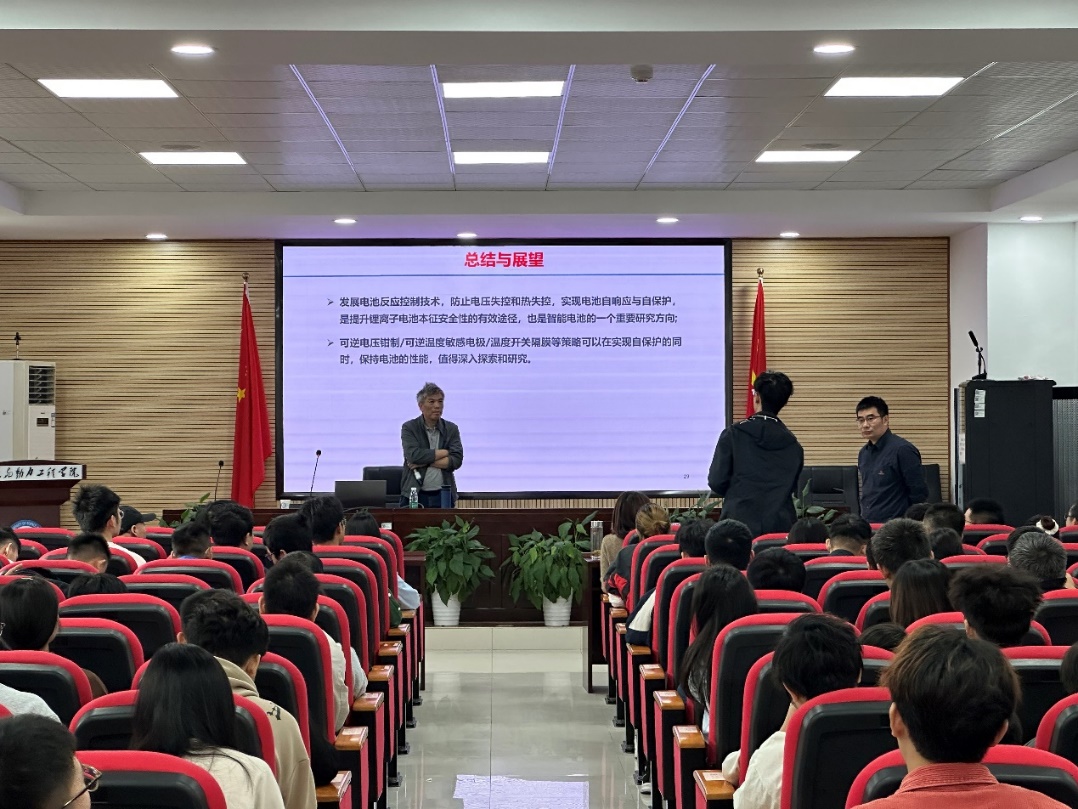 武汉大学艾新平教授做了题为“电池反应控制与自保护技术”的精彩报告。在报告中,艾新平教授以新能源汽车电池起火这一社会热点问题为引导,提出了电池行业发展安全性问题的重要性以及必要性,并说明了锂离子电池出现安全性问题的原因,介绍了其团队为解决这一问题所研究的电压钳制及防过充技术与过热控制及热保护技术,随后艾新平介绍了动力电池智能化的未来发展方向。为我院教师及学生们提供了宝贵的经验。