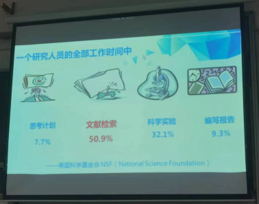张雪梅教授首先向同学们讲述了一个研究人员工作时间中文献检索时间占比50.9%,可见文献检索是研究生必须具备的能力。随后张雪梅教授详细讲解了相关数据库和搜索引擎的使用技巧,如DOI号搜索、布尔逻辑检索等实用技巧;同时,她还介绍了许多搜索引擎,如中国SCI-HUB、知网、谷粉学术、谷歌学术、百度学术、纬度学术等。张雪梅教授不仅传授给同学们文献检索技巧,还为同学们以后可能遇到的问题如参考文献为什么重要性不足提供解决思路。最后,张雪梅教授给同学们介绍了学校图书馆文献传递、超星发现等强大功能。
